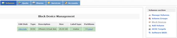 當(dāng)配置好系統(tǒng)的安全訪問控制后,接下來的一步是配置系統(tǒng)磁盤,實現(xiàn)虛擬存儲服務(wù)。在 Openfiler 中,有三類存儲概念:Block Device,Physical Volume 和 Volume Group。其中,Block Device 表示的是實際的物理磁盤;Physical Volume 表示的是物理磁盤的分區(qū),它是組成 Volume Group 的單元;Volume Group 則是由一個或多個物理磁盤分區(qū)(Physical Volume)組成,它又是組成 Logical Volume 的單元。