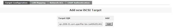 接下來是添加一個 iSCSI Target。首先點擊菜單“Volumes”,然后在右側(cè)的“Volumes section”區(qū)域中選擇“iSCSI Targets”。在“Target Configuration”子菜單中的“Add new iSCSI Target”區(qū)域,選擇列出的“Target IQN”。最后點擊“Add”按鈕,從而添加了一個 iSCSI Target。注意,此處的 Target IQN 信息在后面的對 ESX 服務(wù)器的存儲配置過程中會用到。如圖